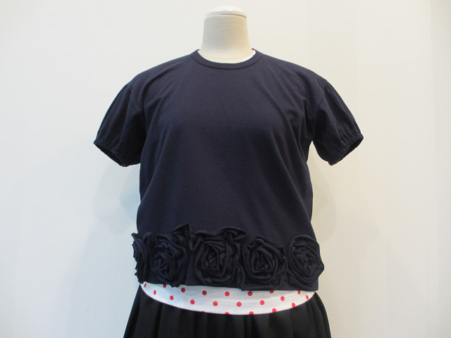 裾にあしらった花のモチーフや、すっきりとしたパフスリーブがほどよい可愛さのある一枚です