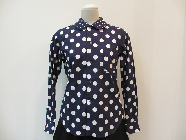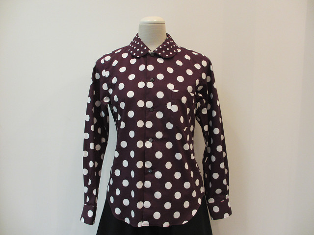 大きさの異なる水玉柄で切り替えられた綿ブロード素材のブラウス。