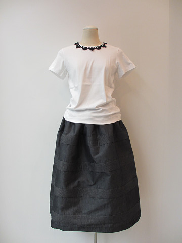 ネックまわりにアクリル毛糸でブランケット刺繍を施したTシャツ。