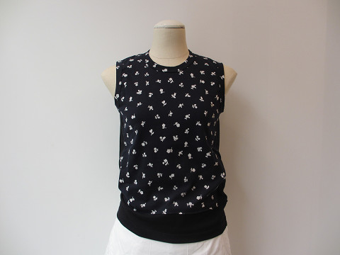 サイドと裾部分を無地の切り替えで引き締めた小花柄プリントTシャツ。