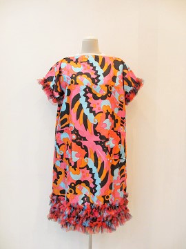 鮮やかなプリント柄が華やかな印象のワンピース。