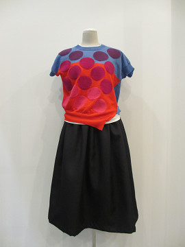 鮮やかなカラーと前身頃の大きな水玉柄が目を引く一枚。