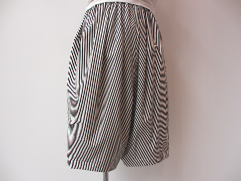 ハリのある綿ブロードストライプ生地を用いたサルエルパンツ。