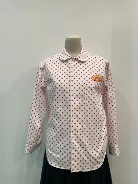 全体に配された愛らしい小ぶりの水玉柄が爽やかな印象のブラウス。