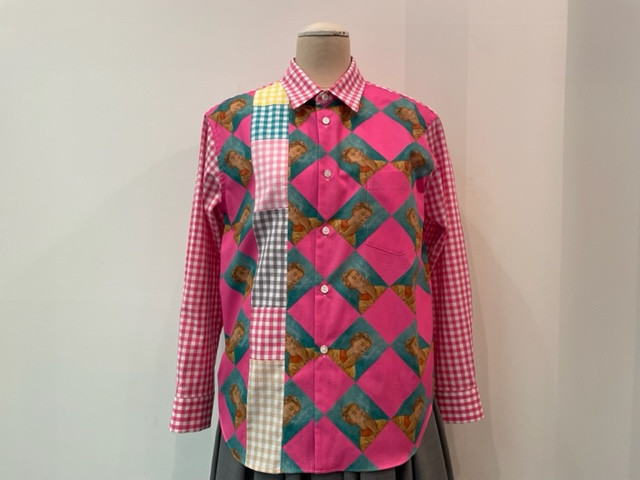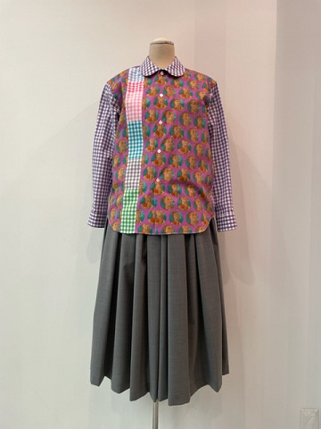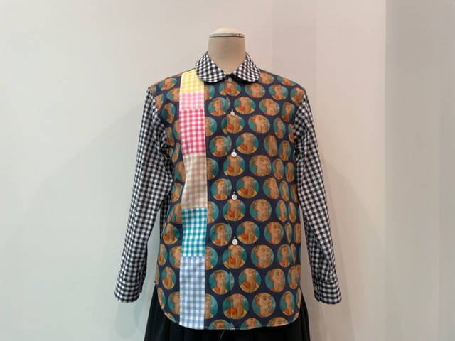 自画像プリントとギンガムチェック柄のパッチワーク風ブラウス。