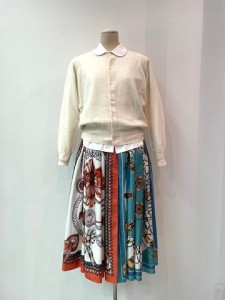 華やかな雰囲気のスカーフ柄プリントをMIXさせたスカート。
